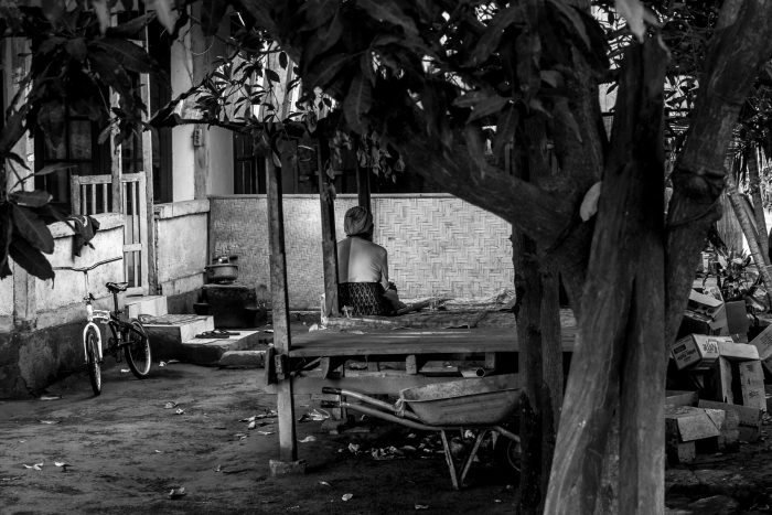 Unser Rückweg kurz vor Sonnenuntergang führt uns erst noch etwas weiter Richtung Norden. Leider besteht der Uferweg größtenteils aus losem Sand. Fahrradfahren ist kaum möglich. Wir ändern unseren Plan den nördlichsten Punkt der Insel zu erreichen und biegen in eine besser befestigte Straße ab. Sie führt uns ins Village. Hier leben doch noch einige Inselbewohner*innen in zweiter Reihe hinter den Touri-Homestays und Bars. Man hört, Gili Air sei die Insel mit der größten Anzahl an einheimischen Bewohner*innen.