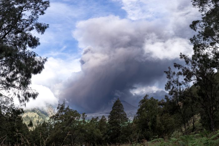 Plötzlich knallt es. Eine Böllerexplosion wie an Silvester, denke ich, nur weitaus heftiger. Ich spüre eine Druckwelle von hinten, wie bei einem starken Donnerschlag während eines Gewitters. Wir alle drehen uns um. Über dem Gunung Baru steht eine tief schwarze, pilzförmige Wolke. Sie hat schon jetzt die drei- oder vierfache Höhe des Vulkans selbst erreicht und wächst schnell weiter. Der Schreck sitzt uns allen in den Gliedern. Andhy schreit „go, go, go“. Darauf springen wir förmlich in den Berg. Wir klettern so schnell es eben geht. Schnell gewinnen wir an Höhe. Doch die Luft reicht nicht aus. Irgendwann kann ich nicht mehr. Wir müssen kurz pausieren. Erstaunt stellen wir fest, dass wir schon einiges an Höhe gewonnen haben. Für mich war das sicher Bestzeit. Ich greife nach meiner Kamera und mache ein Foto durch die Bäume.