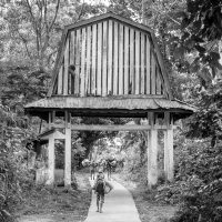Nachdem wir uns umgesehen haben, steigen wir einen Teil der Stufen wieder hinauf und biegen in einen alternativen Weg durch das Reisfeld ein. Dieser führt uns zu einer weiteren, abgelegenen Tempelanlage. Umringt von hohen Bäumen, Lianen und Fels befinden sich hier weiter in den Fels geschlagene „Mönchsklausen“, in denen vor Jahrhunderten betende und meditierende Mönche Unterschlupf finden konnten.