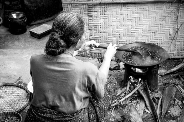 - Lombok-Kaffee wird 50:50 mit Reis gemischt und geröstet