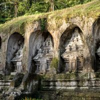 Die Tempelanlage von Gunung Kawi Tampaksiring beherbergt die Königs- und Königinnengräber einer ehemaligen Herrscherdynastie über deren Identität sich Historiker noch streiten. Als wir ankommen, stehen wir vor einer Treppe, deren über 300 Stufen in ein Dschungeltal hinabführen. Wir gehen über eine Reisterrasse und stehen wenig später vor den Königsgräbern. Wie auch die Königinnengräber auf der anderen Seite des kleinen Flusses, der sich hier durch den Dschungel schlängelt, sind diese in den Fels geschlagene Reliefs, welche die Fassade von Tempeln darstellen. Einer Sage nach hat ein Riese aus der hinduistischen Mythologie die Kerben, in denen sich die Reliefs befinden, mit seinem Daumennagel in den Fels gekratzt.